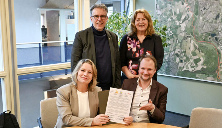 Van links naar rechts op de foto: wethouder Wendy Goodin (Lochem), wethouder Peter Wormskamp (Voorst), Directeur-bestuurder BIJ de bieb Jacqueline Roelofs en wethouder Sjoerd Wannet (Zutphen). Wethouder Hans de Vroome (Brummen) staat niet op de foto.