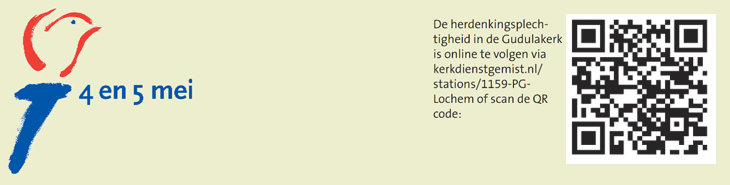 Met medewerking van Muziekvereniging Advendo, het Lochems Mannenkoor en scouting Graaf Otto Groep - De herdenkingsplechtigheid in de Gudulakerk is online te volgen via kerkdienstgemist.nl/stations/1159-PG-Lochem of scan de QR code.