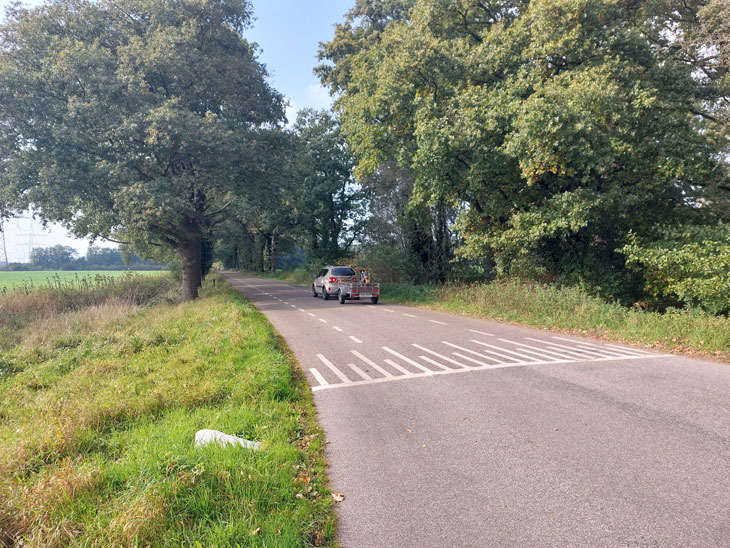 Op de Ampsenseweg komen rode fiets(suggestie)stroken en kruispunten krijgen een afwijkende kleur. Zo vallen de fietsers meer op. Ook leggen we tijdens de herinrichting de grasbetonstenen naast de weg weer goed. Op 2 plekken op de rechte stukken komen Maldense drempels. Dit zijn smalle drempels waar trekkers met hun banden langs kunnen, maar auto’s wel voor moeten afremmen. Verder komt er op de Ampsenseweg een inhaalverbod in de bochten. En plaatsen we houten hekken die passen bij het verblijfskarakter en het landgoed. Alles bij elkaar moet ervoor zorgen dat er minder hard gereden wordt en dat de weg onaantrekkelijk wordt voor doorgaand verkeer.