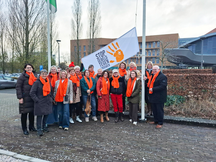 Stop geweld tegen vrouwen! Deze boodschap dragen we de komende periode uit met de vlag die wappert voor het gemeentehuis. Burgemeester Frans Backhuijs en wethouder Wendy Goodin hesen de vlag in het bijzijn van een flinke groep soroptimisten. Soroptimisten verbeteren wereldwijd de levensomstandigheden en de status van vrouwen en meisjes. En dat is nodig, want 1 op de 4 vrouwen en meiden in Nederland krijgt te maken met geweld, fysiek, psychisch of seksueel. Andere medestanders die dit onderwerp een warm hart toedragen waren maandag ook aanwezig. Deze campagne wordt in onze regio georganiseerd door de gemeente Lochem, Soroptimisten Zutphen e.o., Inner Wheel Barchem, De Stek en Welzijn Lochem.